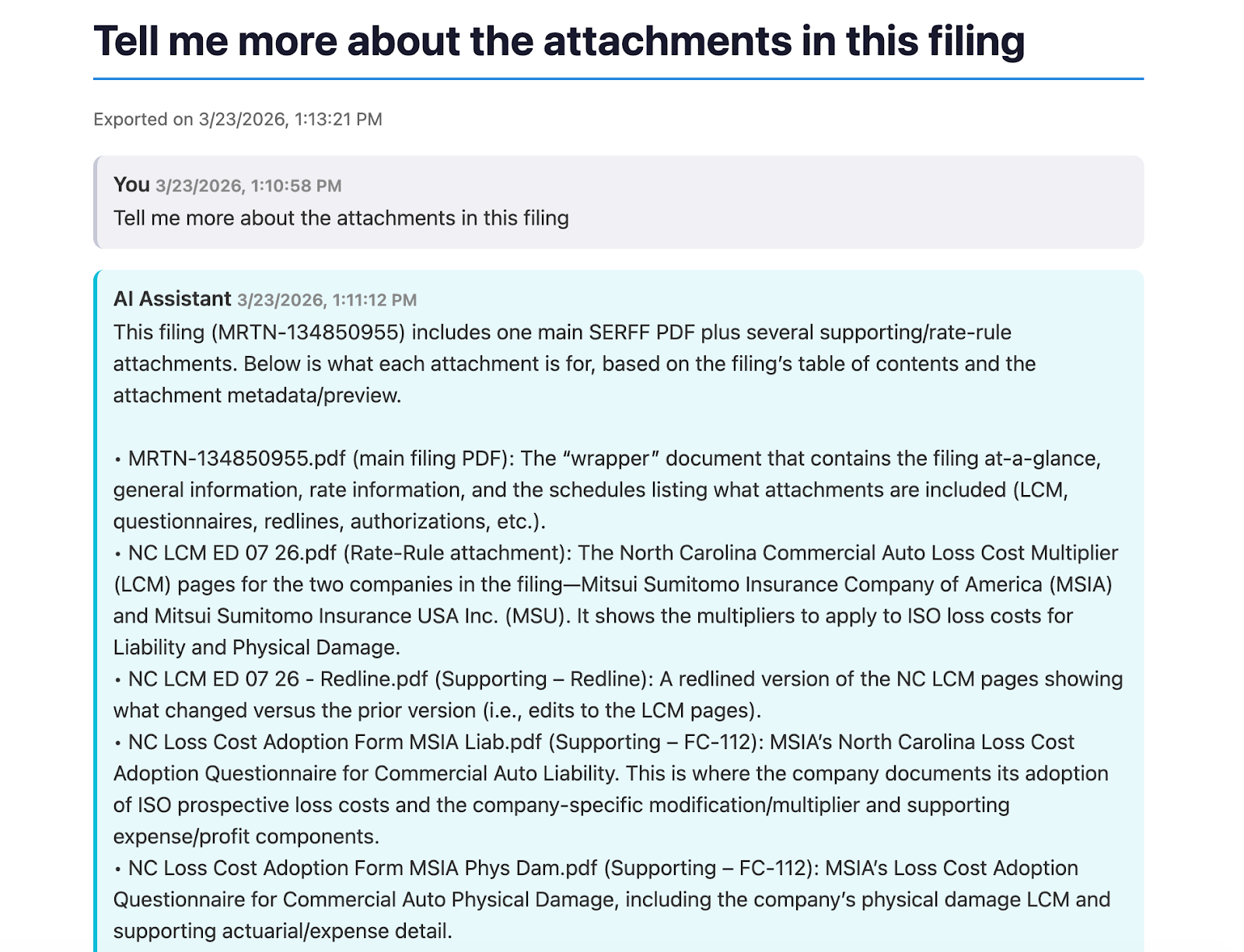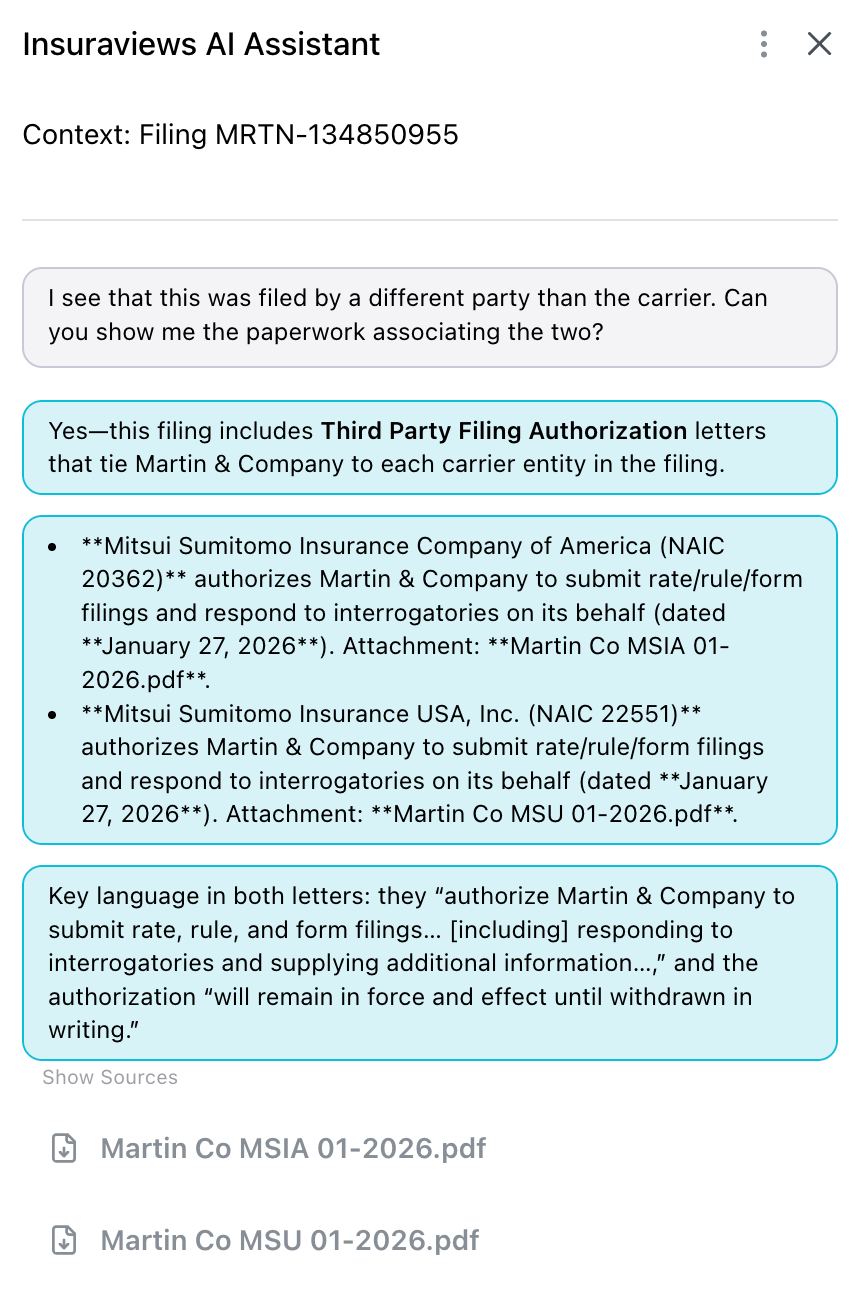 That's changed. The AI Assistant can now analyze the contents of filing attachments directly, not just the top-level filing metadata. Ask it what's in a supporting document, and it will tell you. This is especially useful when you're trying to get up to speed on a complex filing quickly, or when you need to compare how different carriers are justifying similar rate actions.